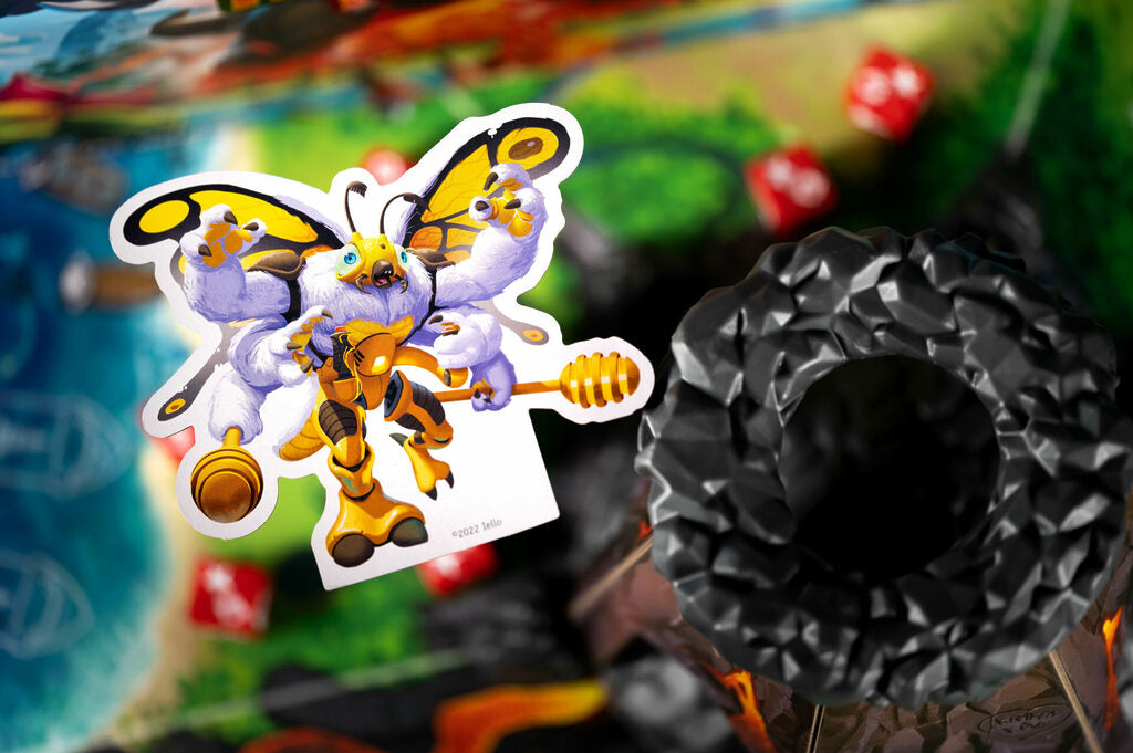 On each turn, players roll the dice to slap, heal, gain energy to buy cards, move around the island, find support or grab a bit of glory. The Boss, on the other hand, is managed by the game. Depending on the result of the dice rolled in the volcano, he moves, activates his Minions and attacks nearby Monsters. His goal? To enable his Minions to erect the Pylons needed to build the portal.