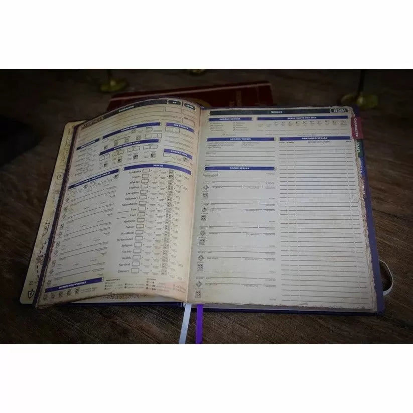 All in a vegan leather cover with book ribbons and lay-flat binding. This is a sturdy book that will survive longer than your character will.