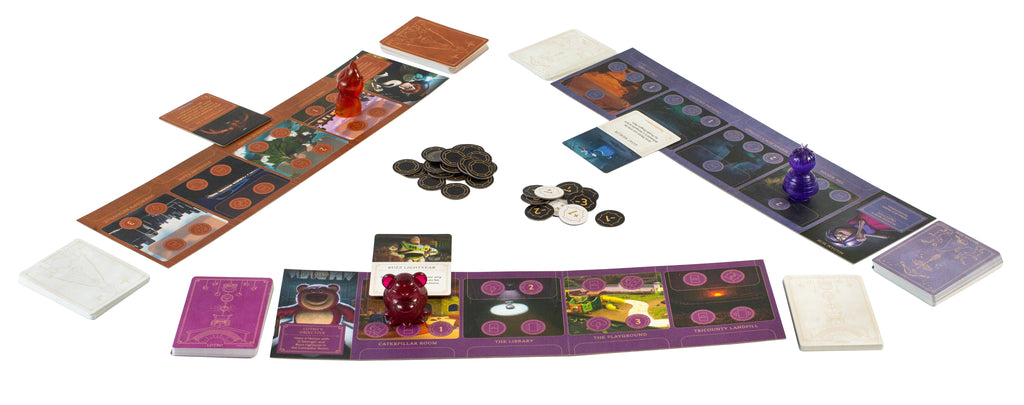 In Villainous: Bigger and Badder, each player takes control of one of three Disney characters, each one a villain in a different Disney movie, specifically Syndrome (The Incredibles), Lotso (Toy Story 3), and Madam Mim (The Sword in the Stone). Each player has their own villain deck, fate deck, player board, and 3D character.
